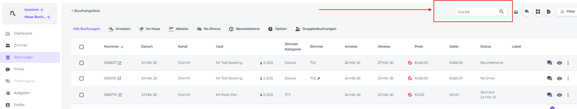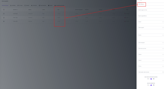 • Alternativ kannst du im Suchfeld oben in der Buchungsliste nach dem Namen, der Systembuchungsnummer oder der Referenznummer (Channel-ID) suchen: