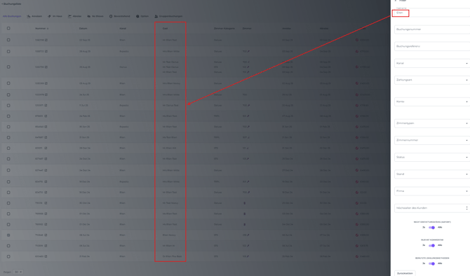 • Im folgenden Beispiel lautet das Kriterium „Gastname ‚Ellen‘“. Da nur ein Kriterium eingegeben wurde, ist die Liste der Buchungen mit dem Gastnamen ‚Ellen‘ höchstwahrscheinlich lang: