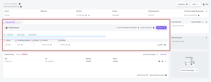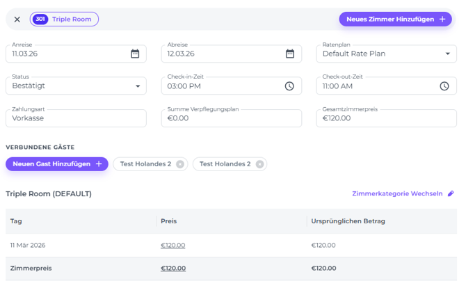 Klicke doppelt auf eine beliebige Buchung – egal ob sie anreist, abgereist ist oder für die Zukunft geplant ist –, um die detaillierte Buchungsseite in einem neuen Fenster zu öffnen. So kannst du die Reservierung einsehen und behältst gleichzeitig den Zugriff auf den Zimmerplan.