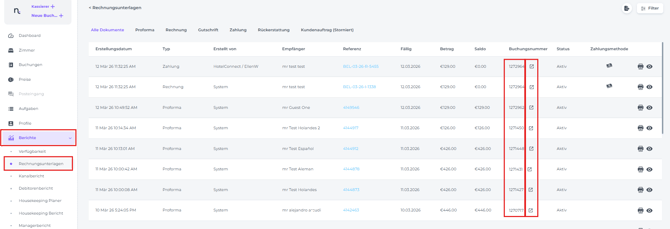 Du kannst Buchungen auch aus verschiedenen anderen Funktionen des Systems heraus öffnen, zum Beispiel im Bericht „Rechnungsunterlagen“: