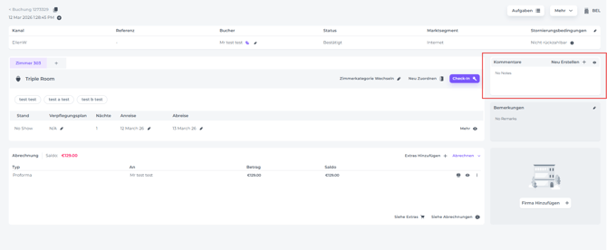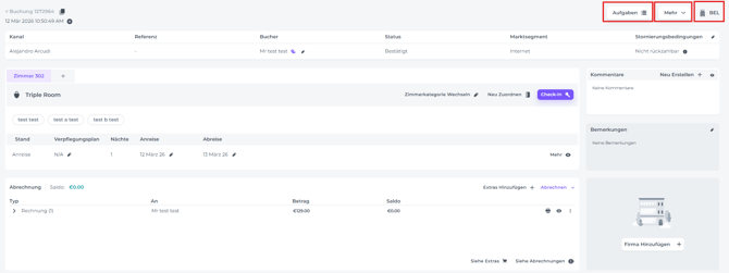 Sobald du die Buchungsseite öffnest, findest du ein zentrales Dashboard, das alle wichtigen Reservierungs- und Gästedaten enthält. Von hier aus kannst du Informationen nahtlos einsehen oder aktualisieren, Aktivitätsprotokolle verfolgen, Check-ins und Check-outs verwalten und E-Mail-Bestätigungen versenden. Die seite ermöglicht dir außerdem: Zimmer mit Leichtigkeit zuzuweisen oder zu ändern. Die Finanzübersicht zu überwachen, um sofortigen Einblick in Zahlungsstatus und Transaktionsverlauf zu erhalten. Salden auszugleichen oder Zahlungslinks direkt an Gäste zu senden. Diese optimierte Benutzeroberfläche stellt sicher, dass du jede Phase des Buchungszyklus von einem einzigen Ort aus verwalten kannst.