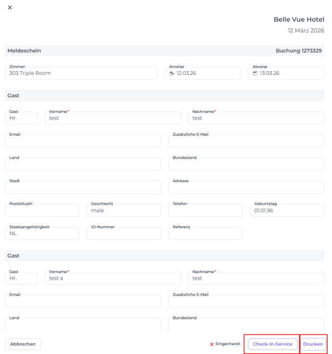 Meldeschein: Öffne den Meldeschein zum Drucken, Bearbeiten oder für den Online Check-In Service.