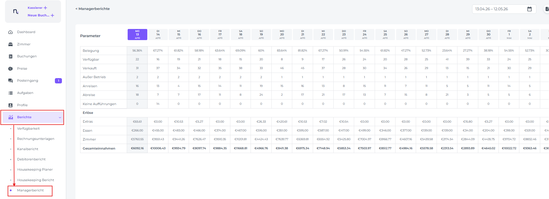 Der Manager-Bericht ist ein umfassendes operatives Dokument, das alle wichtigen Kennzahlen zusammenfasst – einschließlich der täglichen Belegungsrate, der verfügbaren und verkauften Zimmer sowie des Reservierungsstatus (Ankünfte, Abreisen und No-Shows). Auch Zimmer, die auf „Out of Order“ gesetzt wurden, werden hier aufgeführt.