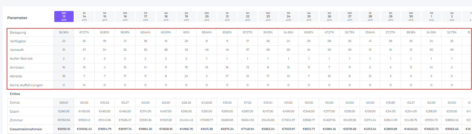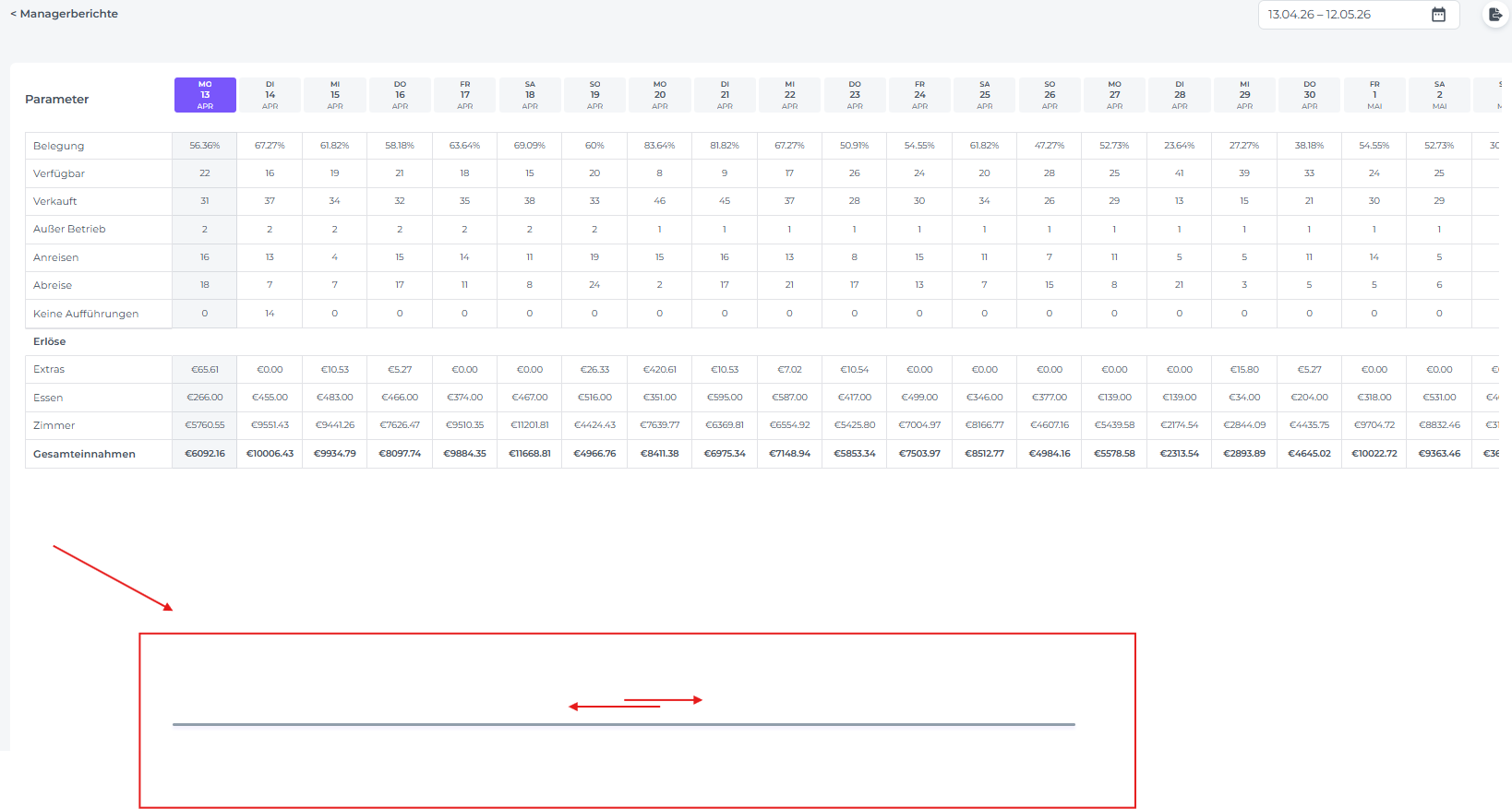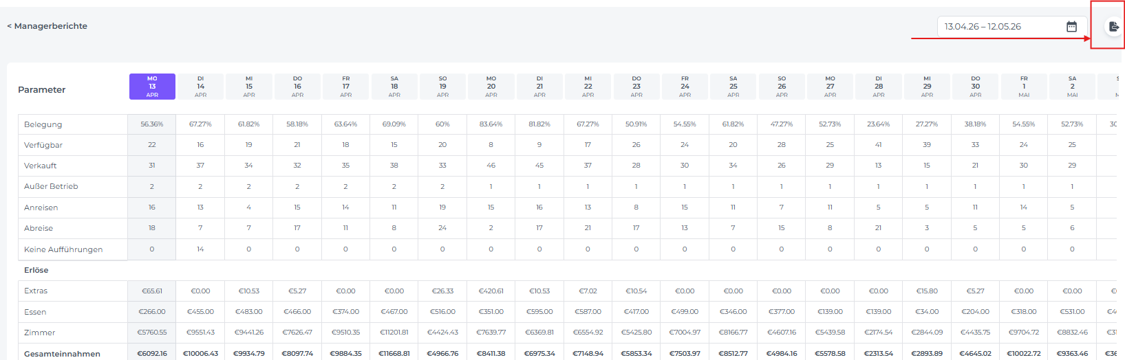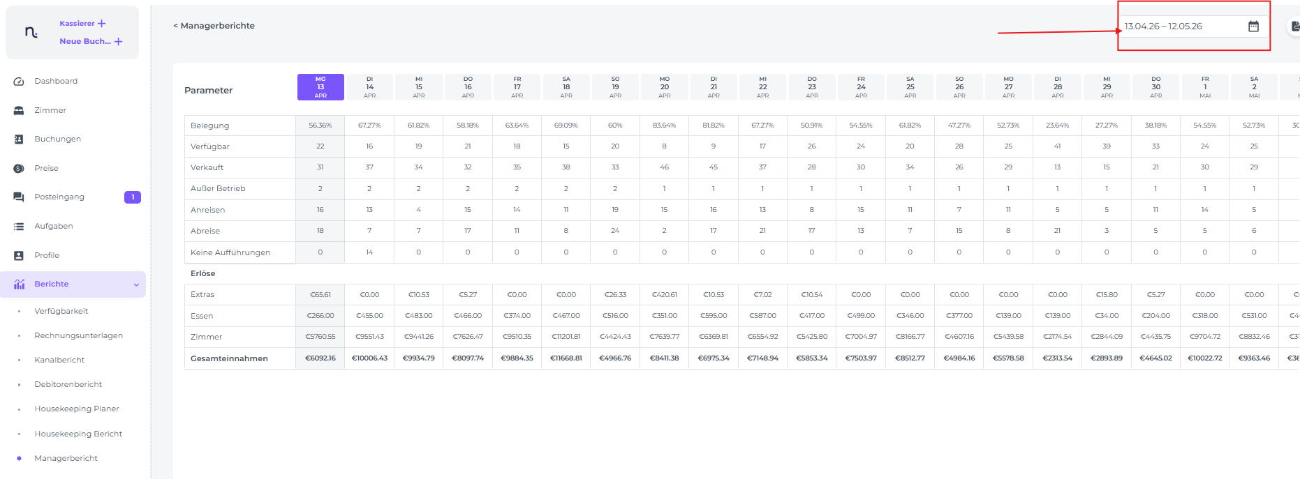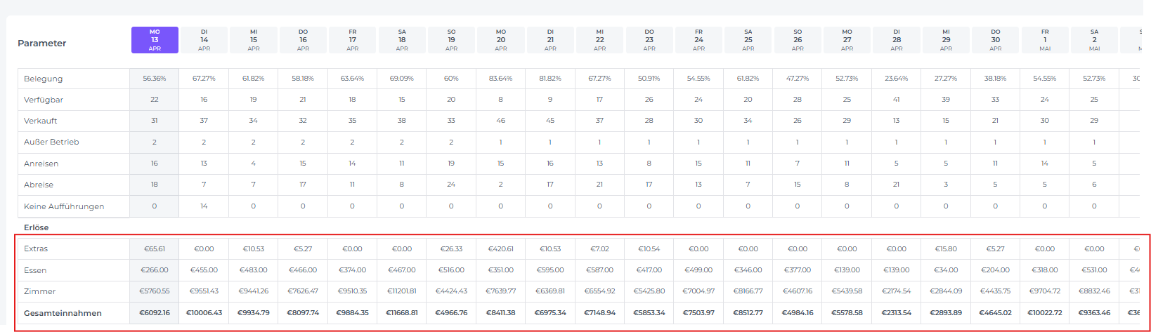 Obwohl der Bericht verschiedene Umsatzarten pro Datum anzeigt (Extras, Verpflegung und Zimmer), empfehlen wir den Umsatzbericht (Demnächst auf Deutsch verfügbar) für tiefere Einblicke in die Einnahmen oder den Auf Bücher-Bericht für detailliertere Analysen von Kennzahlen wie RevPAR und ADR.