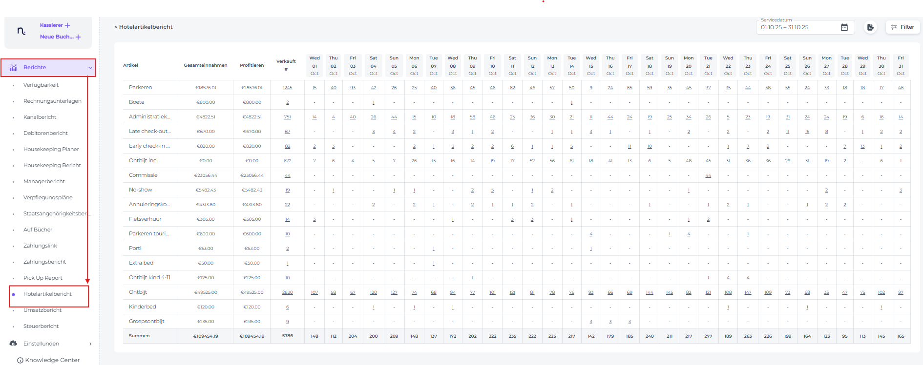 • Der Hotelartikelbericht kann im Hauptmenü unter Berichte gefunden werden: