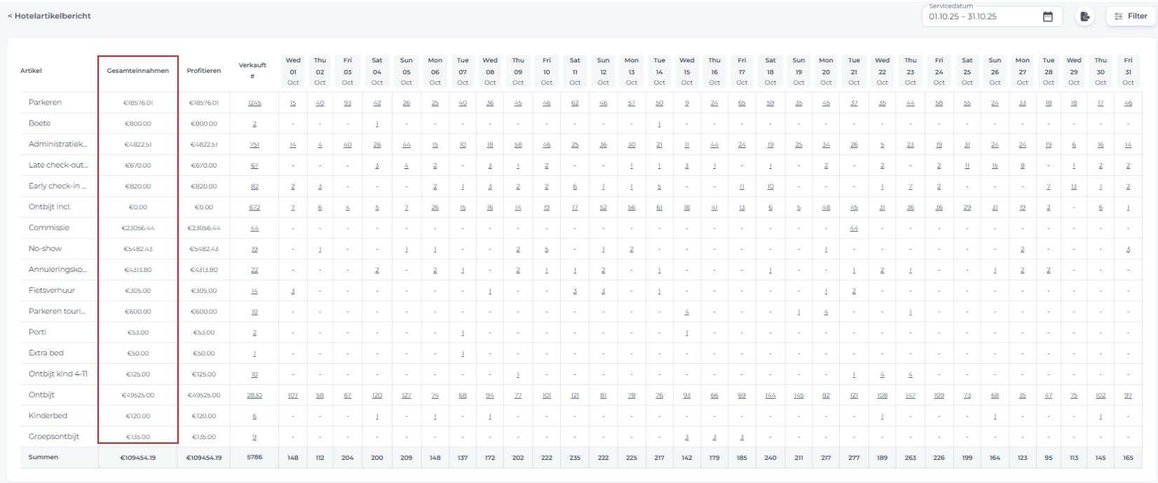 Gesamteinnahmen = der gesamte Umsatzbetrag pro gewähltem Datumsbereich: