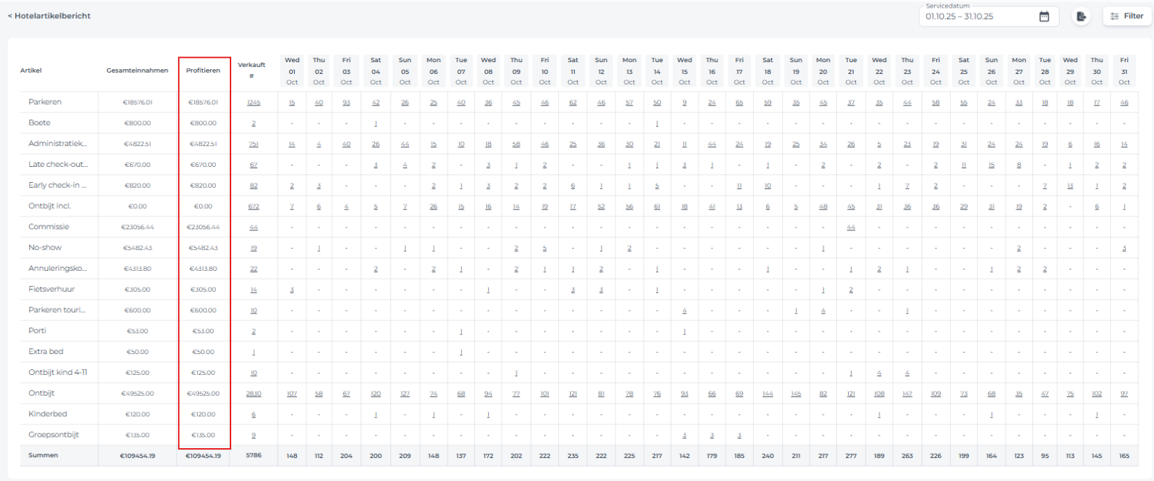 • Exportiere den Hotelartikelbericht, indem du auf das Export-Symbol klickst: