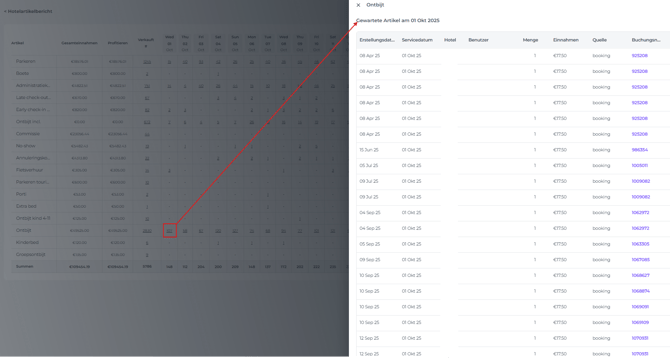 Auf die Buchung zu klicken, in der das Produkt gebucht wurde, um sie zu ändern oder zu identifizieren, wer jeden Artikel gekauft hat, eventuelle Preisanpassungen zu verfolgen, und zu prüfen, ob ein Artikel von einem bestimmten Benutzer gebucht wurde.