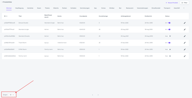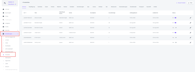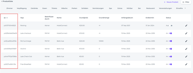 👉 Vorhandene Produkte anzeigen: Die Produktseite zeigt eine Liste aller aktuell definierten Produkte an, einschließlich ihrer ID, Bezeichnung, ihres Preises und anderer relevanter Details.