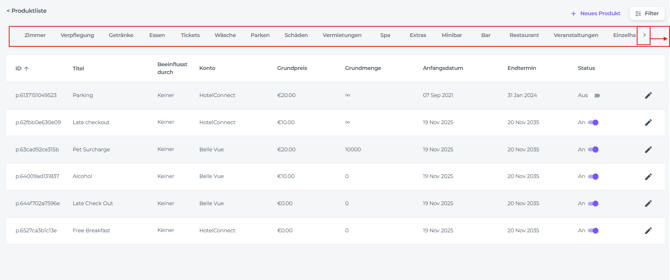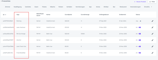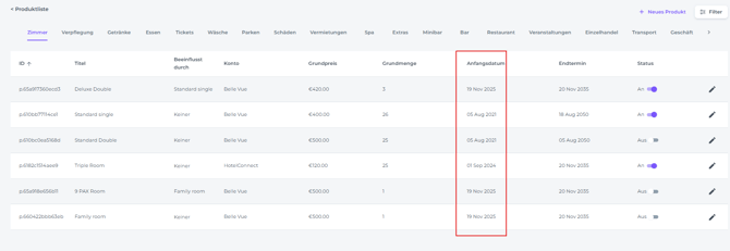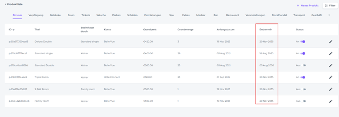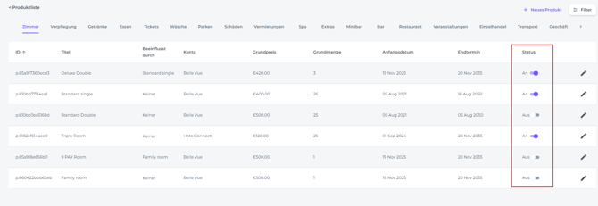 • Status - Ob das Produkt gerade aktiv oder inaktiv ist:
