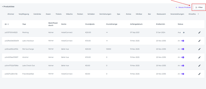 • Klicke auf die Schaltfläche Filtern, um die Produktliste einzugrenzen: