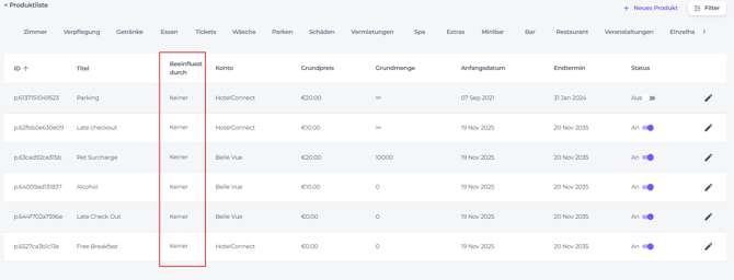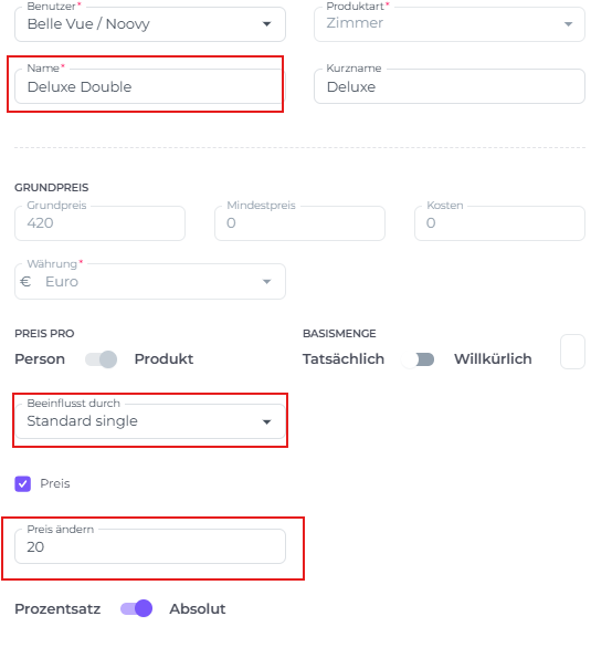 • Beeinflusst durch - Dies ermöglicht es dir, dass ein anderes Produkt den Preis beeinflusst: Im Screenshot unten siehst du, dass das Deluxe Doppelzimmer durch das Standard Einzelzimmer um 20 € beeinflusst wird. Wenn das Standard Einzelzimmer also auf 400 Euro eingestellt ist, wird das Doppelzimmer automatisch 420 € kosten. Im Prinzip kann dies für jedes Produkt erfolgen: