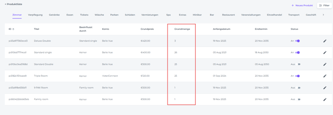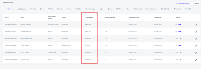 • Grundpreis - Der Grundpreis stellt den Mindestbetrag dar, den du für ein Produkt festlegen möchtest. Wenn du ein Produkt zur Zimmerrechnung eines Gastes hinzufügst, wird dieser Betrag standardmäßig verwendet, es sei denn, du passt ihn bei der Buchung an. Für Zimmer wird empfohlen, den Grundpreis hoch anzusetzen, da die Übernachtungspreise manuell festgelegt und über den Ratenkalender verwaltet werden. Dieser höhere Grundpreis dient als Schutz, um sicherzustellen, dass Zimmer nicht zu unerwartet niedrigen Preisen angeboten werden, falls die Übernachtungspreise im Ratenkalender noch nicht festgelegt wurden: