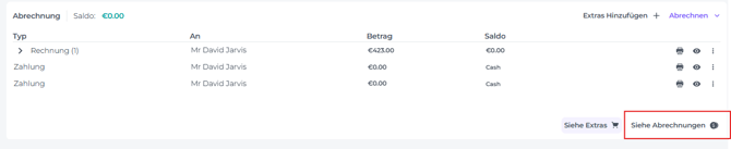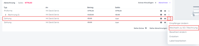 - Klicke auf die drei Punkte (More Action button) hinter den Zahlungen und wähle 'Wechseln zu SO/Rechnung':