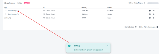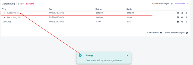 Wenn die Proforma erfolgreich in eine Rechnung umgewandelt wurde, erscheint eine temporäre Nachricht: