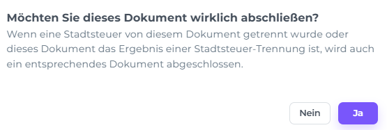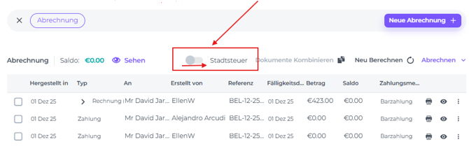 In dem Pop-up-Bildschirm, der erscheint, nachdem du auf Neue Abrechnung geklickt hast: Aktiviere den Schalter für 'Kurtaxe', BEVOR du eine neue Proforma erstellst: Schiebe den Schalter 'Stadsteuer' nach rechts: