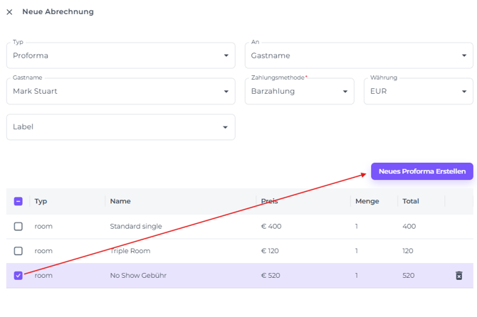 Erstelle eine neue 'No Show' Proforma: