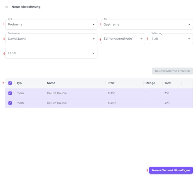 Erstelle die neue Proforma, indem du im Pop-up-Fenster für Neue Abrechnung die Felder wie in der Abbildung unten ausfüllst