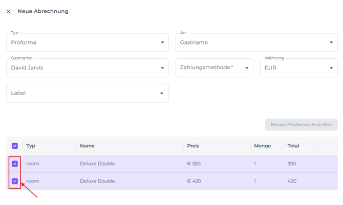 - Kreuze anschließend den/die neuen No Show Element/Artikel an und Klicke auf Neues Proforma Erstellen: