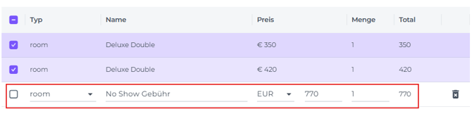 No-Show-Kosten und/oder Stornierungsgebühren sind Zimmerkosten, daher sollte dieser Artikeltyp nicht geändert werden!
