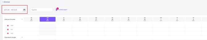 Tage und Zeiträume des Kalenders bestimmen den Zeitraum, der im Zimmerkalender angezeigt wird. Tatsächlich ändert man dort einfach den Datumsbereich, wenn eine Überprüfung von nicht zugewiesenen Buchungen in einem anderen Zeitraum erfolgen soll: