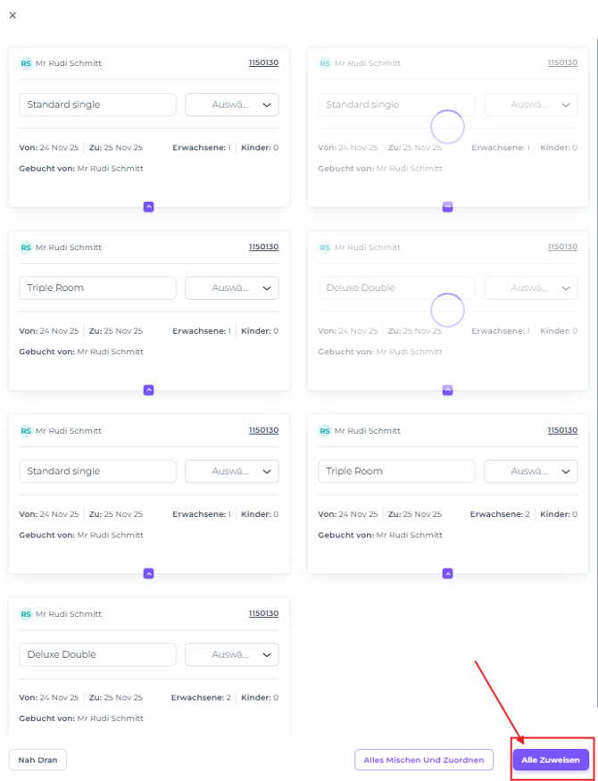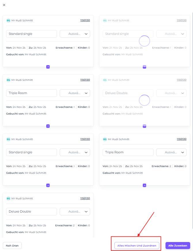 ☝️Trifft es zu, dass gewisse Buchungen die Zimmer für gewünschte Aufenthaltsdauern blockieren, dann benutze Alles Mischen Ud Zuordnen, um Überschneidungen aufzulösen und die Verfügbarkeit zu optimieren: