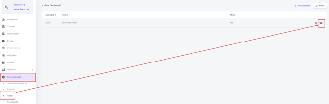 - Taste Einstellungen des Hotels öffnest du mit dem Klick auf das Augen-Symbol: