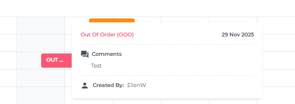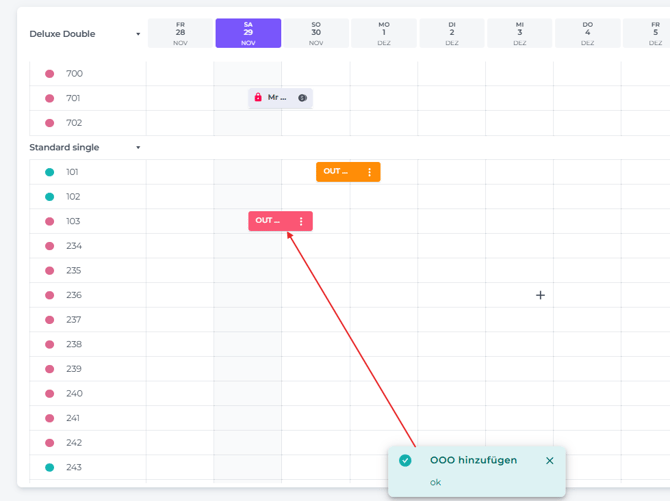 - Das Zimmer wird nun für die ausgewählten Daten als OOO oder OOS angezeigt und es erscheint eine temporäre Bestätigungsnachricht: