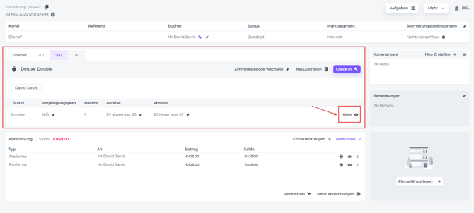 - Gehe auf der Buchungsseite der betreffenden Buchung, für die du Preise ändern möchtest, zum Abschnitt Zimmer/Zuteilung und klicke auf die Schaltfläche Mehr (Augensymbol):