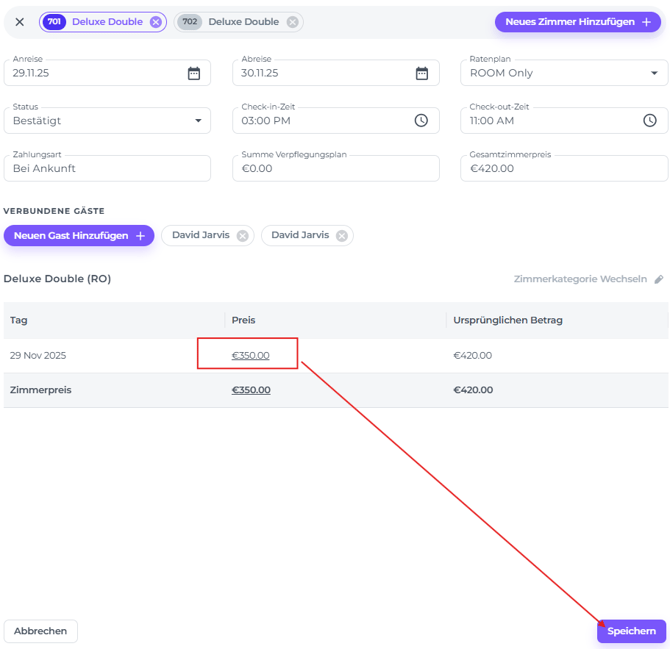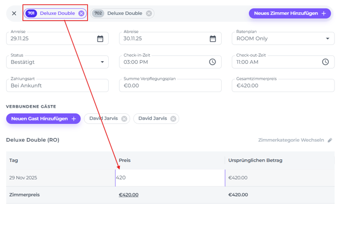 *Wenn es mehrere Zimmer in einer Buchung gibt, stelle sicher, dass du das korrekte Zimmer auswählst, für das du die Preise ändern musst:
