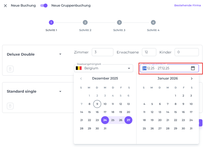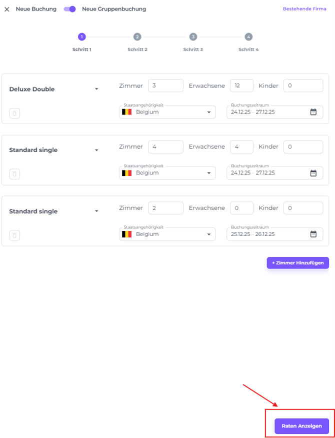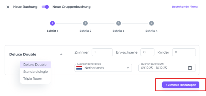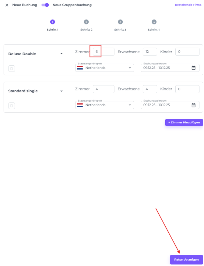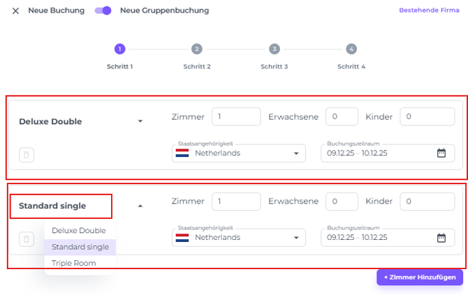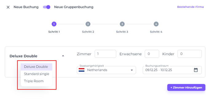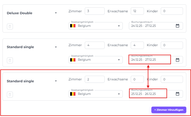 Es ist möglich, unterschiedliche Aufenthaltsdaten pro Zimmertyp innerhalb einer Gruppenbuchung zu haben. Alternativ, wenn du den gleichen Zimmertyp für unterschiedliche Aufenthaltszeiträume benötigst, klicke einfach erneut auf Zimmer Hinzufügen, wähle denselben Zimmertyp aus und weise ein anderes Aufenthaltsdatum zu.
