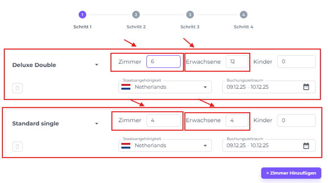 - Für jeden Zimmertyp die Zimmer- und Gästeanzahl festlegen: