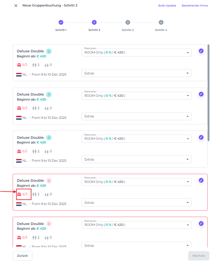 Wenn du mehr Zimmer wählst, als verfügbar sind, nachdem du auf Raten Anzeigen geklickt hast, wird dies in Schritt 2 des Buchungsprozesses angezeigt. Zimmer, die die Verfügbarkeit überschreiten, werden mit einem roten Rahmen hervorgehoben: