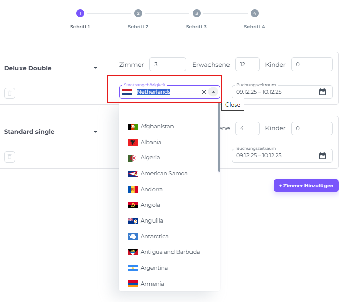 Wähle die Nationalität der Gruppe aus (*die Nationalität einzelner Gäste kann später in Schritt 3 des Buchungsprozesses festgelegt werden):