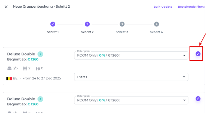 Aktualisiere die Raten pro Zimmer pro Tag, falls verschiedene Raten anwendbar/ausgehandelt sind, indem du auf das Stiftsymbol/den Ändern-Button hinter jedem Zimmer klickst: