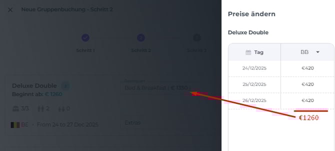 Zur Veranschaulichung zeigt das Bild ein Szenario mit einem Doppeltzimmer, das unter einem Rateplan ausgewählt wurde, der einen Verpflegungsplan beinhaltet. Der angezeigte Gesamtbetrag beträgt 1350 € (inklusive Frühstück), während der Tagesbetrag 420 € für die Nur-Zimmer-Rate widerspiegelt: