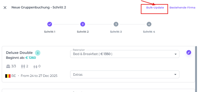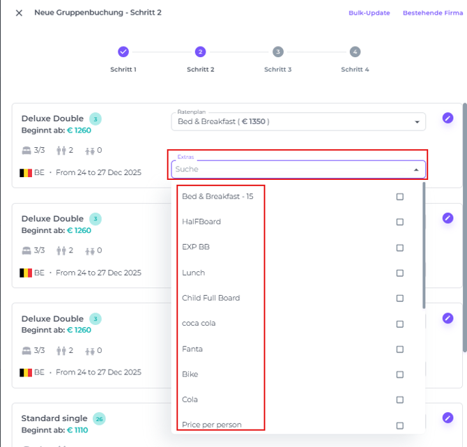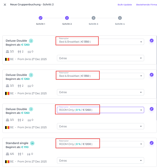 - Ratenplan – Wähle den PRatenplan derjenigen Reservierungen innerhalb der Gruppenbuchung aus, die du anpassen möchten.