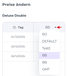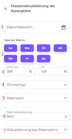 - Zimmertyp – Wähle die Zimmertypen aus, die du basierend auf dem gewählten Zeitraum und der Preisspanne aktualisieren möchten.