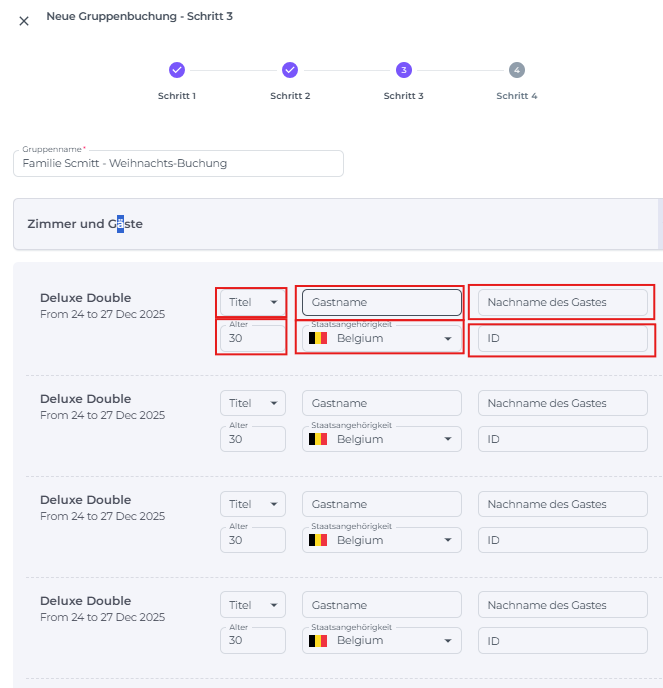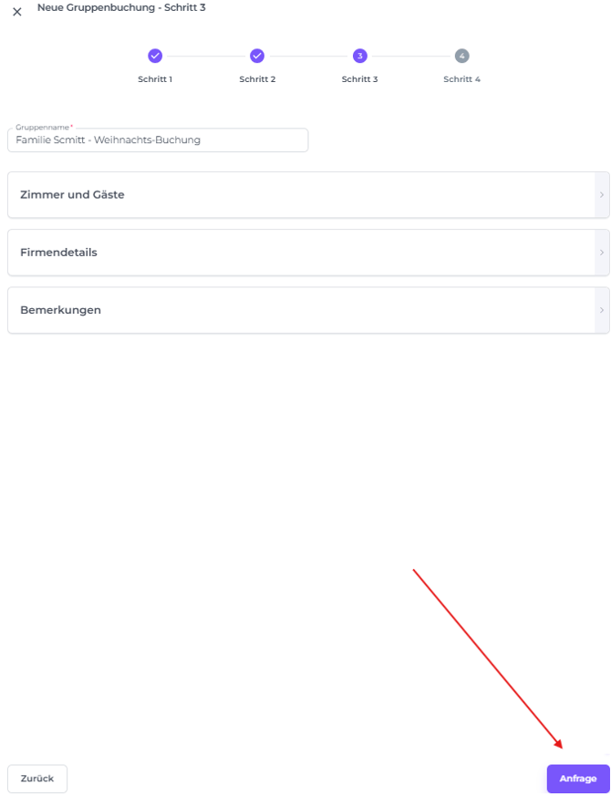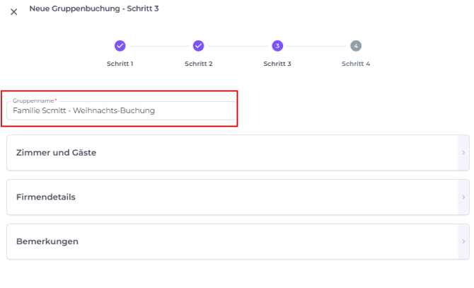 Du musst diesen Schritt nicht sofort abschließen. Wenn der Bucher noch keine Zimmerliste bereitgestellt hat, kannst du die Zimmer trotzdem sichern, indem du die Gruppenbuchung jetzt erstellst und die Gästedaten hinzufügst, sobald diese verfügbar sind.