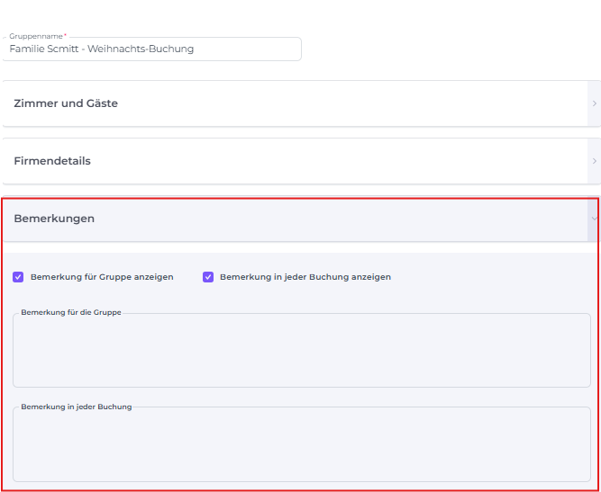 Füge eine Bemerkung zur Gruppenbuchung oder zu den einzelnen Reservierungen innerhalb der Gruppe hinzu: