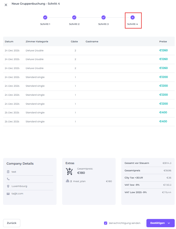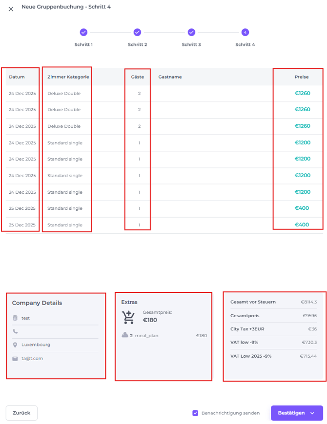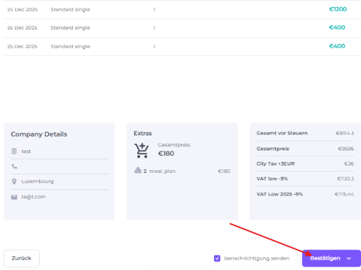 Verifiziere alle Buchungsdetails, einschließlich Zimmertypen, Raten, Extras, Firmeninformationen und Gesamtsaldo, bevor du bestätigst: