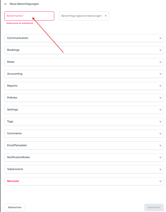 • Sobald alle Felder ausgefüllt sind, klicke auf Speichern, um die Erstellung der Neuen Rolle abzuschließen: