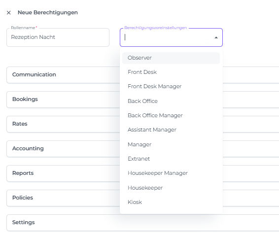 • Navigiere vom Hauptmenü aus zu Einstellungen - Berechtigungen - Neue Rolle: