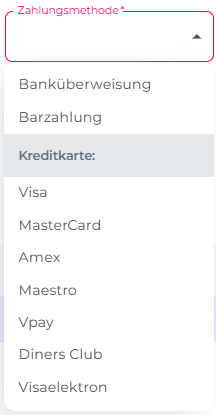 - Zalungsmethode - Je nachdem, welche Zahlungsmethoden verfügbar sind (die für dein Hotel im System konfiguriert und aktiviert wurden), wählst du die zutreffende aus.