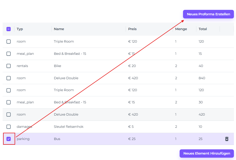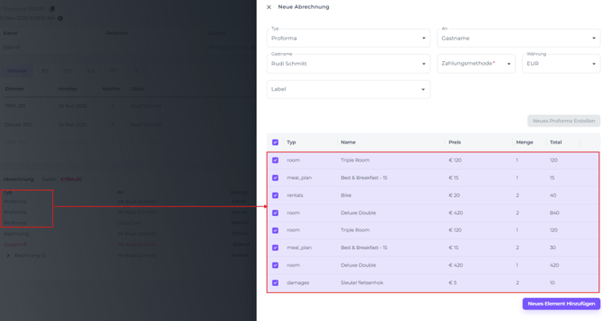 Daher musst du das Kästchen des hinzugefügten Element anhaken, bevor du auf Neue Proforma erstellen klickst: