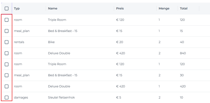 Posten, die bereits in existierenden Proformas enthalten sind, erscheinen ausgewählt (angekreuzt). Wenn du diese Posten nicht auf deiner neuen Proforma haben möchtest, deaktiviere sie einfach.