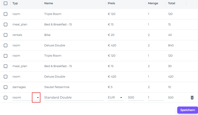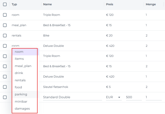 Es wird eine neue Zeile zur Elementenliste hinzugefügt. Klicke auf den kleinen Pfeil in der Spalte Postentyp, um den Posten auszuwählen, den du auf der Proforma haben möchtest: