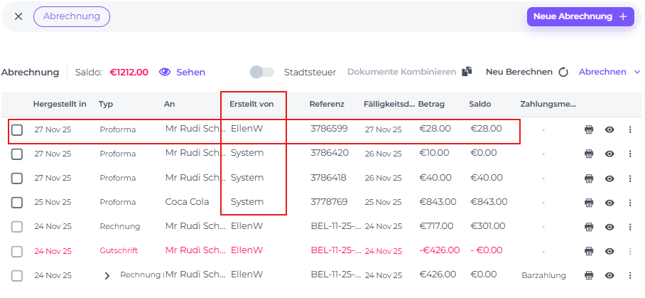 - In dem Pop-up-Fenster, das daraufhin erscheint, kannst du die manuell erstellte Proforma des Benutzers EllenW sowie die automatisch vom System erstellten sehen: