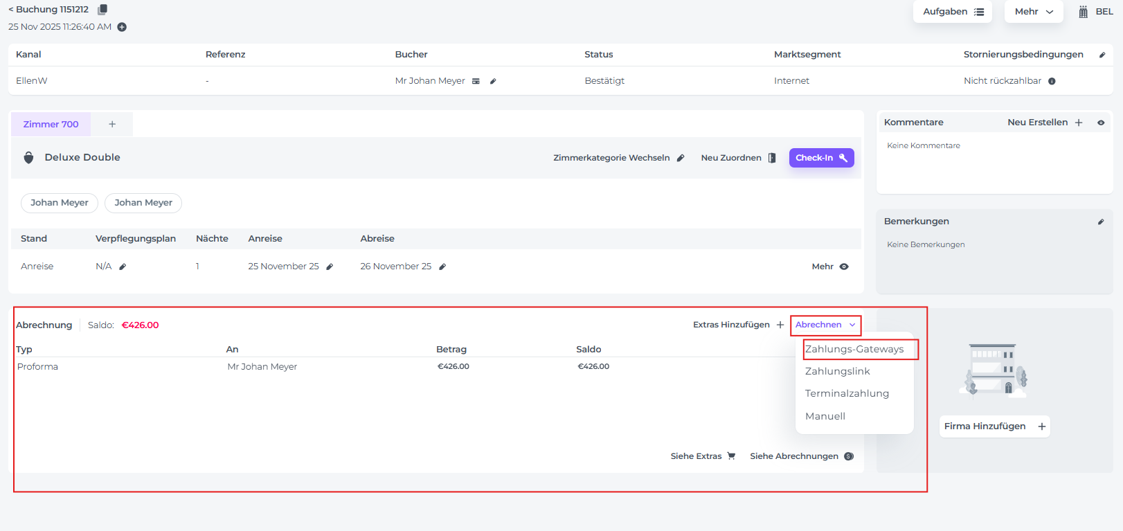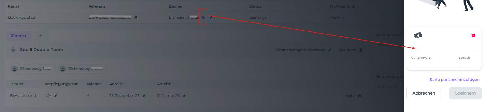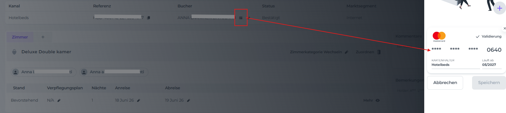 erstellen möchtest. - Überprüfe, ob der Buchung eine Kreditkarte beigefügt ist (Kreditkarten-Symbol); dies ist im Allgemeinen der Fall, wenn die Buchung über eine Online-Plattform erstellt wurde: