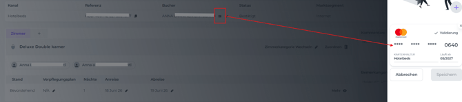 • Überprüfe, ob der Buchung eine Kreditkarte beigefügt ist (Kreditkarten-Symbol); dies ist im Allgemeinen der Fall, wenn die Buchung über eine Online-Plattform erstellt wurde: